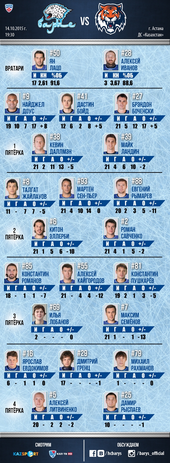 Сегодня в 19:30 в Астане состоится матч Континентальной хоккейной лиги между «Барысом» и хабаровским «Амуром». Состав «Барыса» на игру: