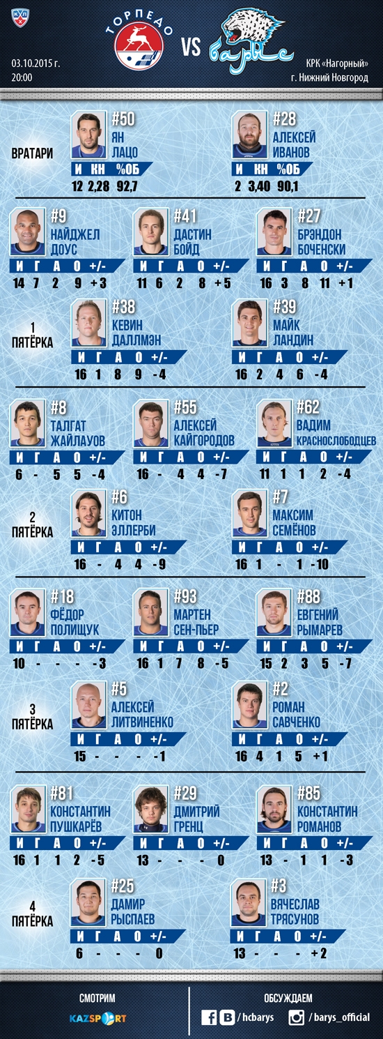 Сегодня в 20:00 по Астане в Нижнем Новгороде состоится матч Континентальной хоккейной лиги между «Торпедо» и астанинским «Барысом». Состав «Барыса» на игру: