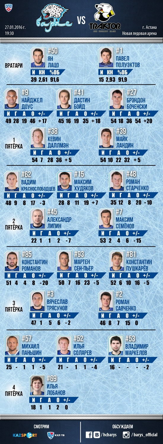 Сегодня в 19:30 в Астане состоится матч Континентальной хоккейной лиги между «Барысом» и «Трактором» из Челябинска. Состав «Барыса» на игру: