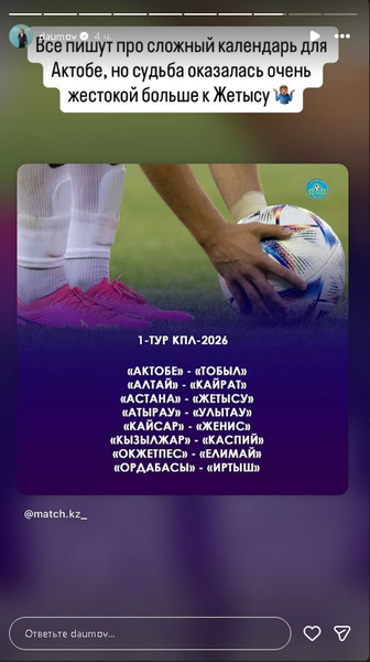 «Все пишут про сложный календарь для „Актобе“, но судьба оказалась куда более жестокой к „Жетысу“», — написал Даумов в сторис инстаграма.