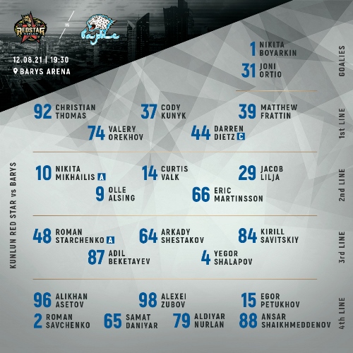 Стал известен состав астанинского «Барыса» на матч против пекинского «Куньлунь Ред Стар» в рамках Кубка Президента.