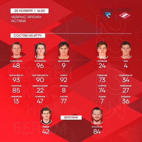 Московский «Спартак» представил состав на выездной матч регулярного чемпионата КХЛ против астанинского «Барыса», передает Sports.kz со ссылкой на Shaiba.kz.