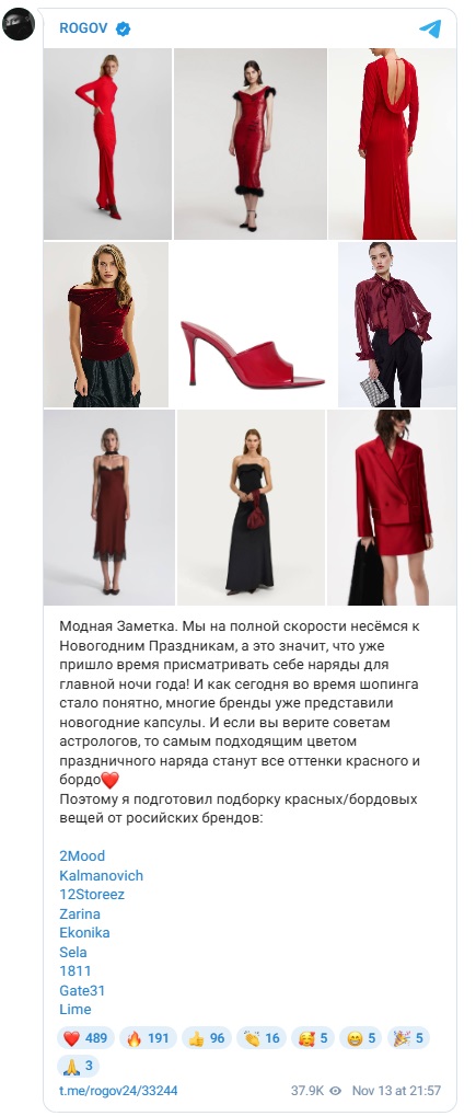 "Мы на полной скорости несемся к новогодним праздникам, а это значит, что уже пришло время присматривать себе наряды для главной ночи года! И как сегодня во время шопинга стало понятно, многие бренды уже представили новогодние капсулы. И если вы верите советам астрологов, то самым подходящим цветом праздничного наряда станут все оттенки красного и бордо", – написал стилист.