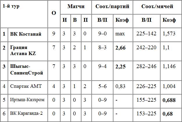 В Высшей лиги «А» в субботу между собой встретятся команды, пока еще не проигрывавшие на турнире — ВК «Костанай» и «Шыгыс СвинецСтрой». И если костанайский коллектив выиграл все три свои матча «в сухую», то устькаменогорской команде пришлось дважды доказывать свою силу на тай-брейках. Последняя победа в пяти партиях над уральской «Грацией», позволила обеим командам набрать по семь очков. На два больше у костанаек. Именно этому трио и предстоит на выходных внести итоговую ясность в расстановке команд после первого тура.