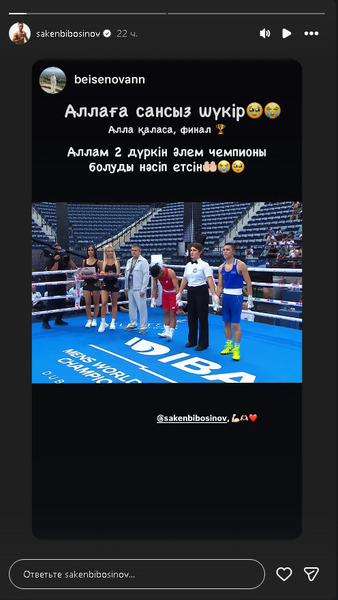 Дай, Аллах, финал. Пусть Всевышний дарует стать дважды чемпионом мира!», — написала девушка в сторис в инстаграм.