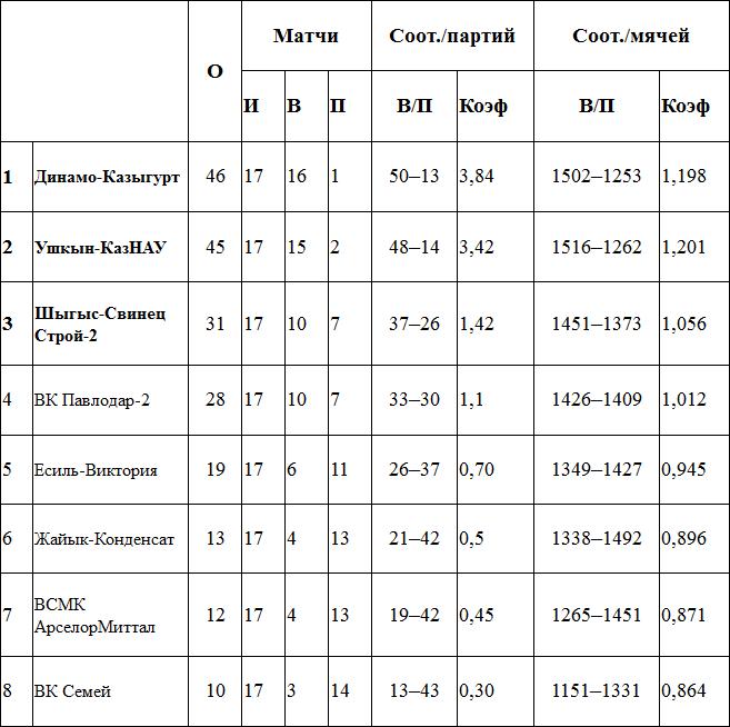 «Динамо-Казыгурт» (Шымкент), «Ушкын-КазНАУ» (Алматы), ВК «Семей»,