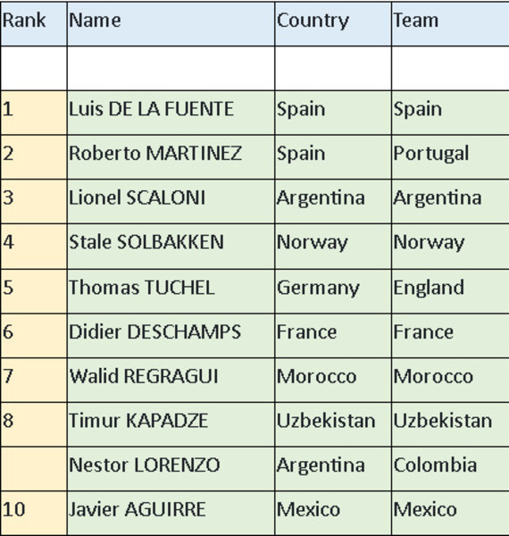Лидером рейтинга стал главный тренер сборной Испании Луис Де Ла Фуэнте. На второй позиции расположился наставник сборной Португалии Роберто Мартинес. Третье место списка занимает рулевой национальной сборной Аргентины Лионель Скалони.