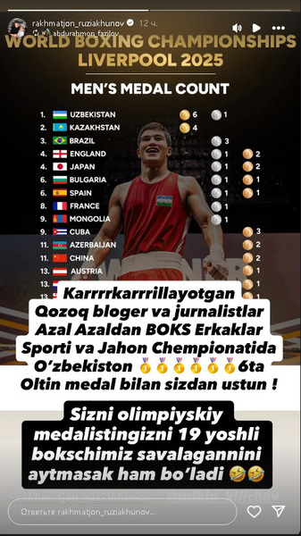Узбекистанский специалист репостнул в своём инстаграм пост с результатами мужского медального зачёта чемпионата мира-2025 по боксу в Ливерпуле, где мужская сборная Узбекистана завоевала шесть золотых медалей и превзошла казахстанцев, ограничившихся четырьмя. На себя обращает внимание комментарий автора публикации.