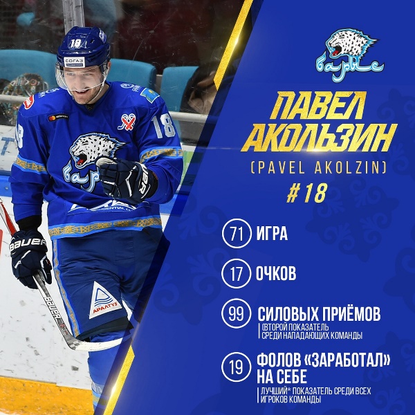 Нур-султанский «Барыс» подвел статистические итоги прошедшего сезона для одного из своих нападающих Павла Акользина, передает Sports.kz.