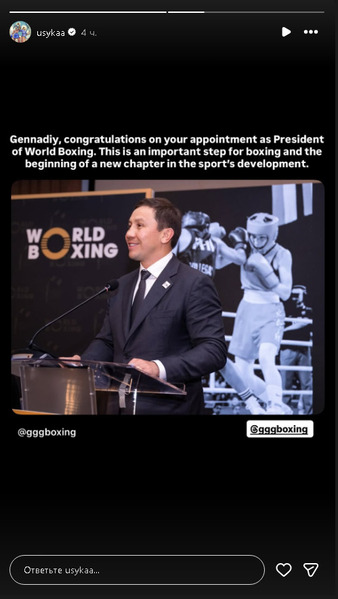 «Геннадий, поздравляю с Вашим назначением президентом World Boxing. Это важный шаг для бокса и начало новой главы в развитии этого вида спорта», — написал Усик.