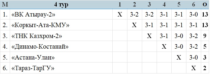 4-й тур (24-29 марта 2014. Астана). Победитель — ВК «Атырау-2» и «Коркыт-Ата-КМУ»