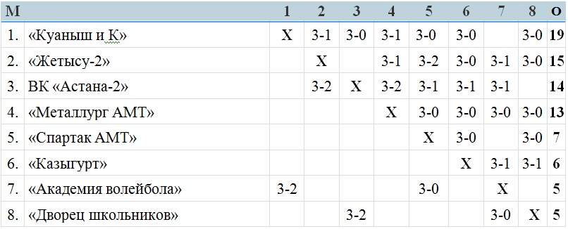 «Дворец школьников» (Астана), ВК «Астана-2», «Металлург АМТ» (Темиртау),