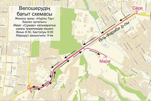 Традиционно велопробег стартует в 9.00 с территории БЦ «Нурлы-Тау», откуда велоколонна направится вверх по проспекту Аль-Фараби до пересечения с улицей Жароковой, затем участники, совершив круговой разворот, спустятся вниз по Аль-Фараби в сторону международного комплекса трамплинов «Сұңқар», где их ожидает финиш. Кроме того, на финише среди участников будут разыгрываться ценные призы и подарки от организаторов.