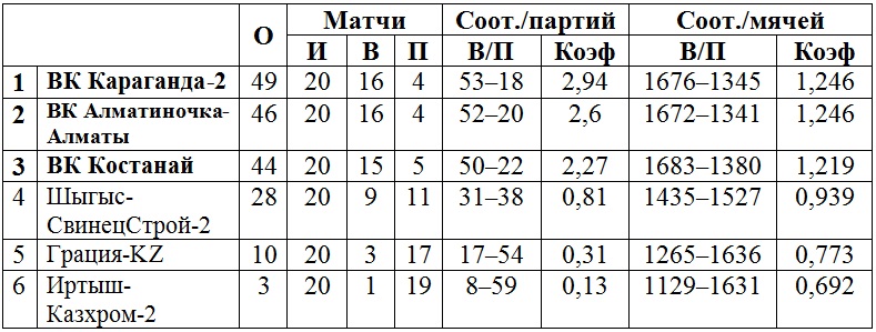 Таким образом, по итогам тура определились имена всех будущих призеров первенства — фарм-клуб устькаменогорского «Шыгыс-СвинецСтроя» при всем желании уже не догоняет лидирующее трио. В заключительном туре, который намечено провести в Алматы с 22-го по 29-е апреля, трио в лице — ВК «Караганда-2», ВК «Алматиночка» и ВК «Костанай», окончательно определится с комплектами своих наград.
