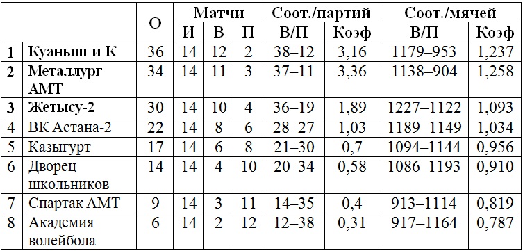 «Дворец школьников» (Астана), ВК «Астана-2», «Металлург АМТ» (Темиртау),