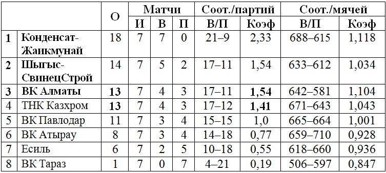 Подгруппа «Б»: ВК «Алматы», ВК «Павлодар», «Шыгыс-СвинецСтрой», ВК «Тараз».