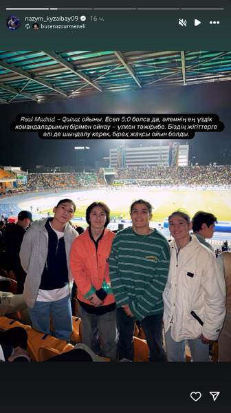 «Матч „Кайрат“ — „Реал Мадрид“. Счёт — 5:0, но игра против одной из лучших команд мира — это большой опыт. Нашим ребятам ещё нужно закаляться, но игра получилась хорошей», — написала девушка в своем инстаграм.
