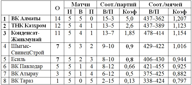 Подгруппа «Б»: ВК «Алматы», ВК «Павлодар», «Шыгыс-СвинецСтрой», ВК «Тараз».