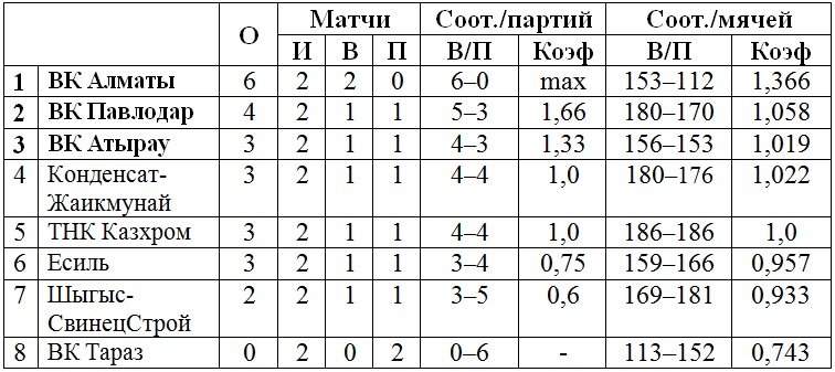 Подгруппа «Б»: ВК «Алматы», ВК «Павлодар», «Шыгыс-СвинецСтрой», ВК «Тараз».