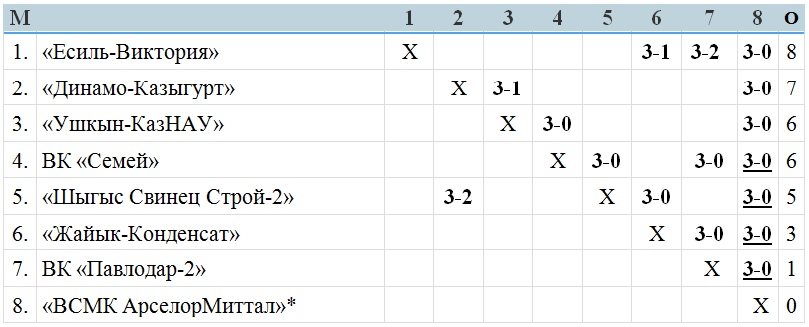 ВК «Павлодар-2» — «ВСМК АрселорМиттал» — 3:0 техн. (25-0, 25-0, 25-0)
