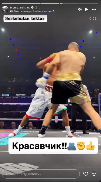 Отметим, что бой казахстанского актёра и боксера из Узбекистана состоялся вчера на «Хумо Арене» в Ташкенте. Поединок завершился за 72 секунды, когда узбекистанцу было зафиксировано техническое поражение.