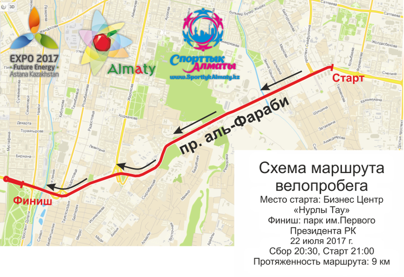 Участников велопробега ждет небольшая разминка перед стартом и девятикилометровый маршрут. Участники ночного велопарада стартуют в 21:00 и поедут по проспекту Аль-Фараби в западном направлении в сторону парка Первого Президента РК.