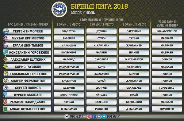 Профессиональная футбольная лига Казахстана продолжила отмечать лучших футболистов и тренеров июля.