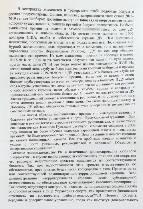 Хоккеисты и тренеры «Бейбарыса» написали коллективное письмо премьер-министру Казахстана Аскару Мамину и акиму Атырауской области Махамбету Досмухамбетову с жалобой на руководство клуба, а именно на Булата Бушанова.