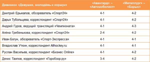 32 российских журналиста сделали свои прогнозы на серии плей-офф Восточной конференции КХЛ «Авангард» — «Автомобилист» и «Металлург» — «Барыс».