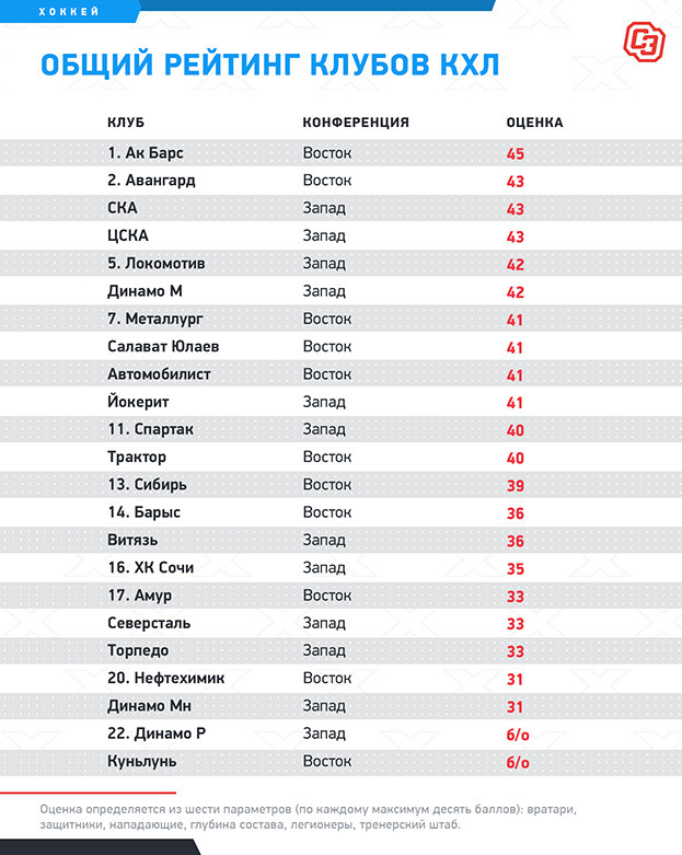В нем команды оцениваются по нескольким показателям: силе их вратарской, защитной и атакующей линий, глубине состава, уровню тренерского штаба, а также мощи легионерских бригад. Затем результаты суммируются.