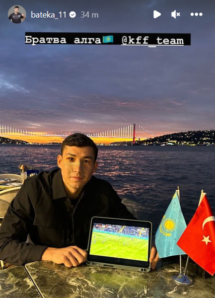 В разделе «сторис» на своей странице в социальной сети Зайнутдинов показал фото с побережья моря в Стамбуле, где он смотрит матч Казахстан — Сан-Марино на планшете, и оставил следующее обращение партнерам по команде: «Братва, алга!».